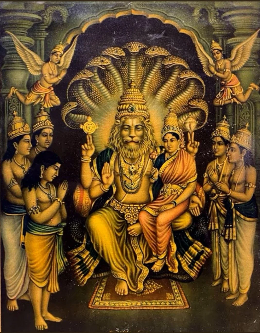 The lord incarnates age after age to restore balance, protect the virtuous, and vanquish the wicked. Allegedly born from the sweat of Lord Śiva during his tapas, Maṅgal Graha (planet Mars) is said to be associated with the story of Narasiṃha.