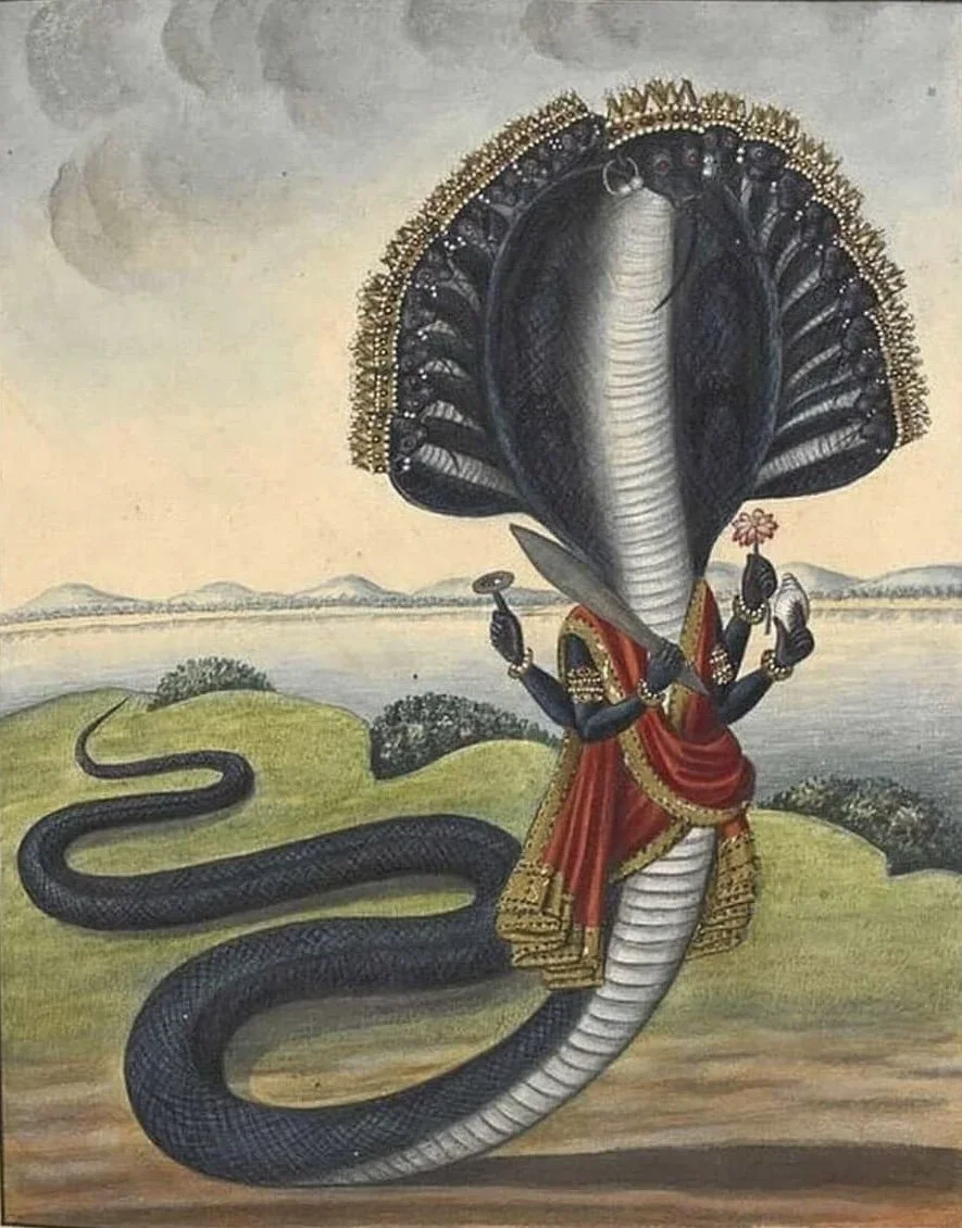 Counted among the eleven Rudras—forms of Śiva—Ahirbudhnya is linked to fertility, Kuṇḍalinī energy, and the subconscious forces of Nature. His energy is both creative and destructive, reflecting the profound alchemy of transformation and spiritual awakening that unfolds in the hidden depths.