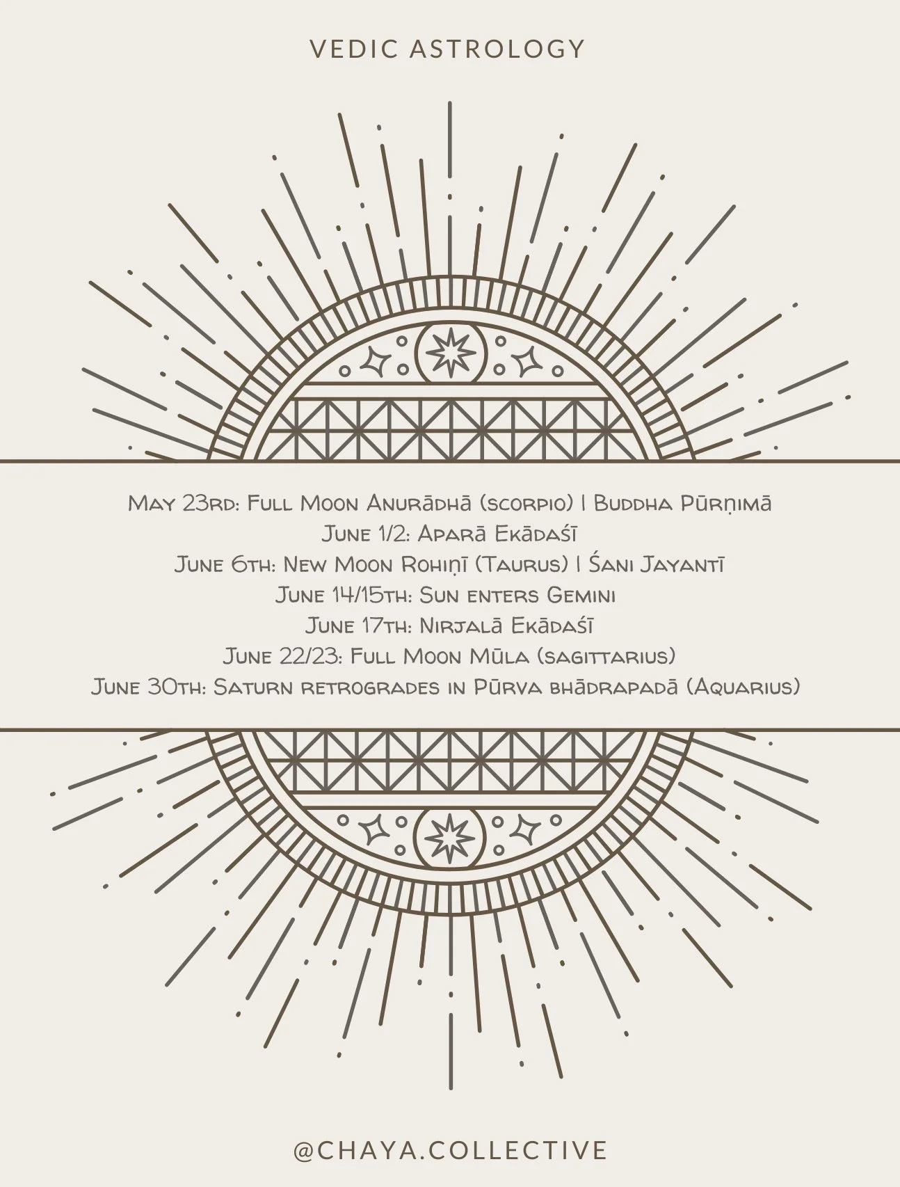 This new moon initiates a month of manifesting one’s thoughts and desires, especially around creativity and romance, as Rohiṇī is famed for bestowing support for growth on the material plane.